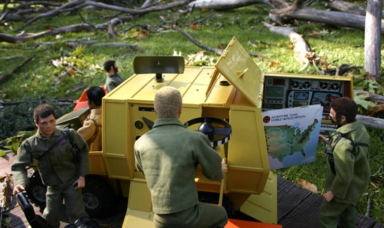 A wide range of vehicles were produced for the Adventurer line; one of the most elaborate (and expensive) being the Mobile Support Vehicle. This vehicle in particular had the potential to provide a wide range of imaginative play value; it came with a range of accessories, and included a battery operated radar scanner and a searchlight. The cab could hold two AT members on a mission. The line included several small sets at a price point that more kids might afford with their own allowance; ones that converted into backpacks, such as "Escape car." There were also a number of helicopter variations, a variety of one-man six-wheeler "power hogs," a "Avenger Pursuit" multi-function vehicle, and a "Big Trapper" vehicle offered around the introduction of the "Intruder" figures. The military jeep was brought back, but was of the blow-mold construction typically associated with imitation products.