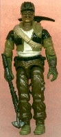 The original version of Alpine's action figure was released as part of the 1985 edition of Real American Hero toys. Appearance: black hair and mustache; green and black cap; black goggles; white shirt with green and black jacket; green gloves with brown wrists; yellow rope across chest; brown pants with black belt and green boots. Accessories: beige backpack with canteen and clip for axe; black Barretta SMG-12; black GRB-88 grappling-hook rifle; large, black pickaxe; two black grappling hooks joined by string. |