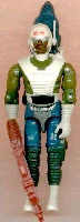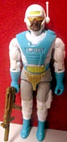 Dee-Jay was released in the 1993 series of A Real American Hero toys, as part of a mailaway offer with Stalker, Sub-Zero and Snow Serpent. Appearance: white helmet with gold goggles and bar on forehead; white shirt with light blue armor vest and gloves; grey pants with gold codpiece, light blue boots, and white grey leggings and holster Accessories: white antenna; gold "Tracker" submachine gun; black figure stand. |