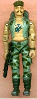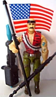 A Real American Hero (1992) Gung-Ho was part of the 1992 series of A Real American Hero toys.---- Appearance: bald with black mustache; black headband; green vest with open collar and black stripes; ammo belt on chest; black right armband; beige pants with brown belt, holster, and boots Accessories: rectangular, black pouch backpack (with sculpted rope and canteen); huge black machine gun with handle on top, single grip, and triangular stock; black spring-loaded missile launcher with shoulder rest and blue trigger; blue missile with extra-thick tip; United States flag on black flagpole; black figure stand. Variations: Briefly available in early 1993 on a Battle Corps card with Battle Corps accessories. |