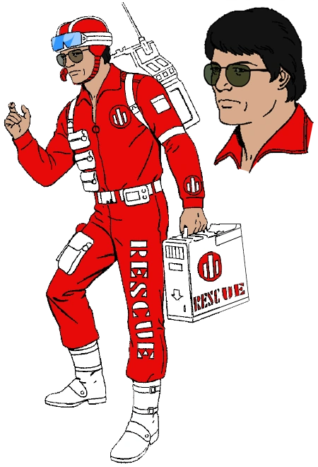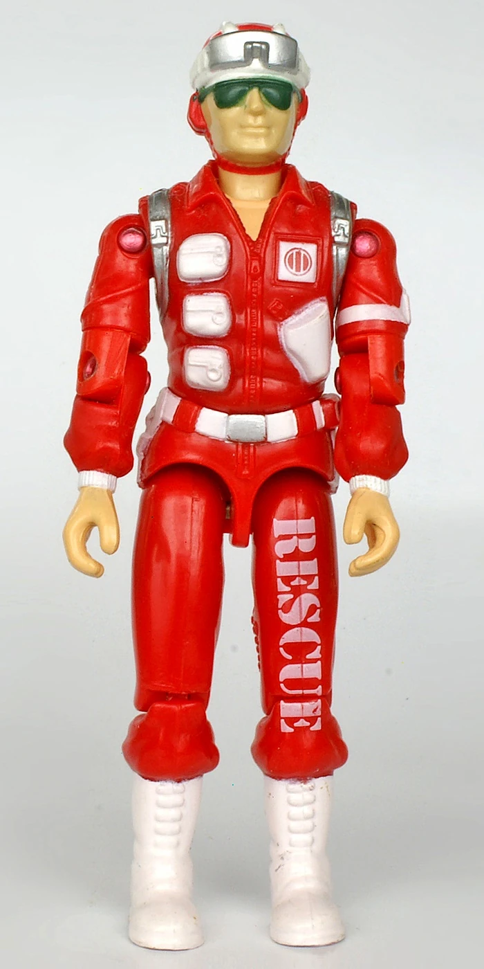 This Lifeline was only available through a Rice Crispies mail-in offer in 1991. Kelloggs didn't want him to have any weapons, so legs without the pistol molded on the thigh were taken from 1985 Frostbite. The figure came in a plastic baggie, so there was no filecard. Appearance: red and white helmet with silver goggles; black hair; green sunglasses; red open-collar shirt with white pockets and silver backpack straps; red pants with white belt, pockets, and boots; "Rescue" on left leg Accessories: silver backpack; white medical pack |