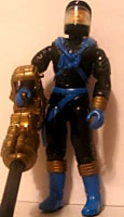 In 1993, Payload joined the Star Brigade subline of A Real American Hero toys. Appearance: black helmet; black shirt with blue diagonal straps and gloves; gold wristbands; black pants with blue belt and holster; blue boots with gold tops Accessories: neon red "Updraft" pistol; neon red "'92 Shockwave" XM-15; neon red "Ambush" submachine gun; neon red "'91 Low-Light" knife; gold "'93 Duke" spring-loaded missile launcher with neon red trigger; two neon red "Law" missiles; neon red figure stand. |