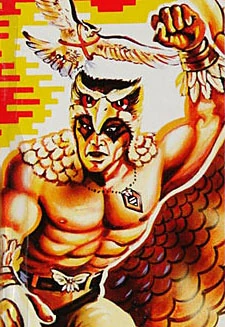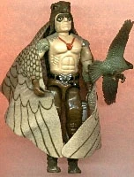 The lone Raptor action figure was released in 1987. Appearance: brown bird-head helmet; black face-paint around eyes; no shirt; red medallion; feathers on shoulders; orange-brown pants; black belts with silver falcon buckle; brown gloves and bird-foot boots with feathers Accessories: tan wing cape/backpack; brown and off-white falcon. |