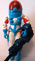 Roadblock heads to outer space when he is included in the Star Brigade subset of 1993. Appearance: bald with black mustache and goatee; white flight suit with light blue helmet support, straps, gloves, and boots; red stripes on arms, side, and legs Accessories: blue '91 Hawk" helmet with red face shield; gold "Muskrat" shotgun; gold "Tracker" submachine gun; gold "'91 Grunt" machine gun; gold "Muskrat" machete; black "'93 Duke" missile launcher; two gold "Bazooka" missiles; gold figure stand. |