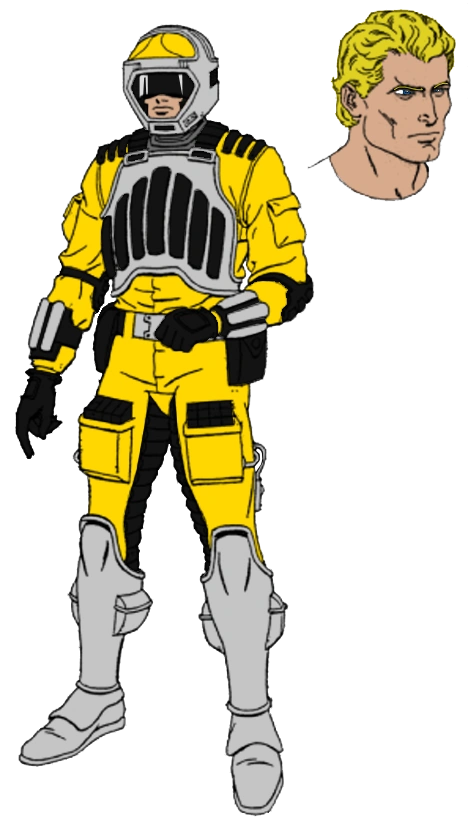 A new Sci-Fi action figure was released for the year 1991. Like most of the carded action figures sold that year, he came with a spring-loaded missile launcher. Appearance: black hair; grey shirt with black vest; yellow zipper and gloves; grey pants with yellow stripes on legs; black armbands, belt and boots Accessories: soft, black helmet with chinstrap and silver eyepieces; silver backpack (with engraved tanks and hoses); short, silver laser rifle with scope and flared muzzle; large, silver spring-loaded missile launcher with padded shoulder rest; yellow missile with unique texturing on front half and button on back; standard short, black hose; standard long, black hose. |