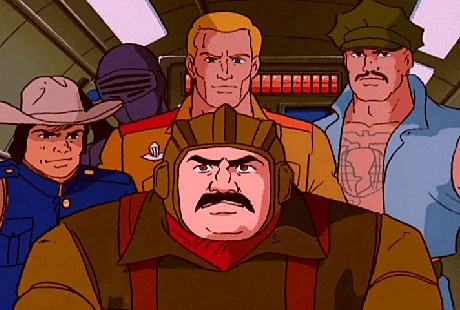 As the Joes race away, Duke's motorcycle is shot and after recovering from the fall, he uses part of a hill as cover. Snake Eyes jumps off his bike and runs to help his friend, and soon all of the Joes are fighting the approaching Cobra forces. Dusty tells the Joes that they might be in trouble. "What?! Just because we're outnumbered twenty to one?" Gung-Ho asks sarcastically. As the Oktober Guard approaches the Joes, they shoot over the Joes and attack Cobra, an act that surprises Gung-Ho, since it appears that Russians are helping the Joes. But Duke explains that the Oktober Guard are helping themselves to the battle with Cobra.