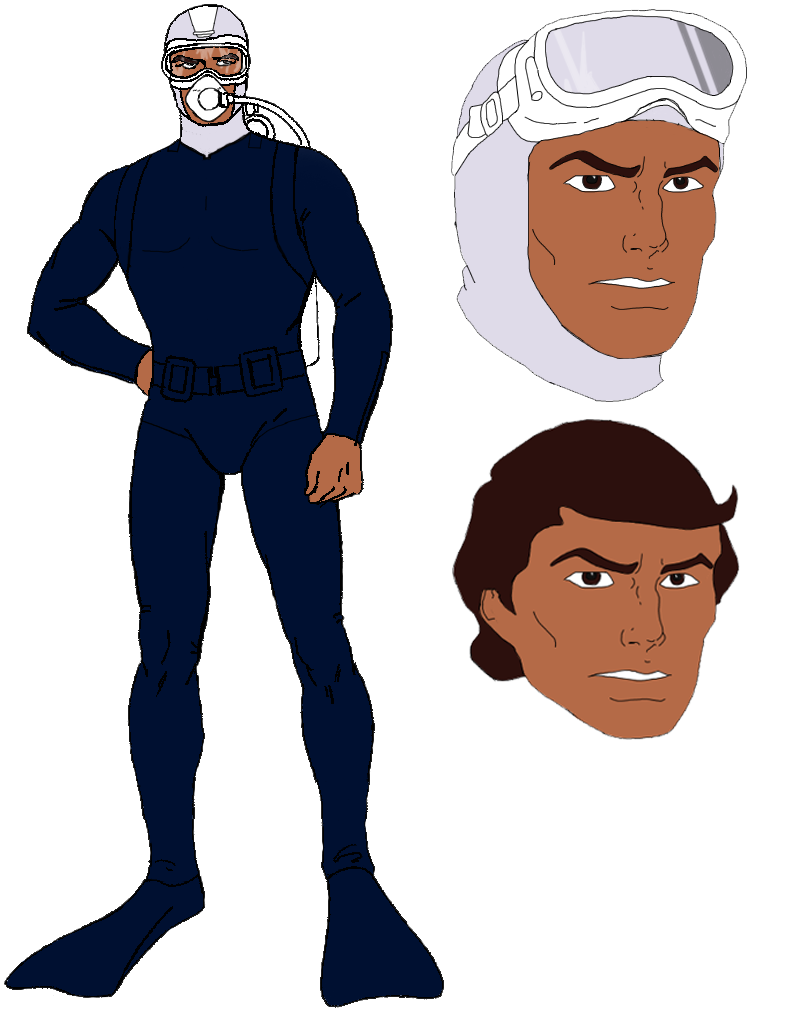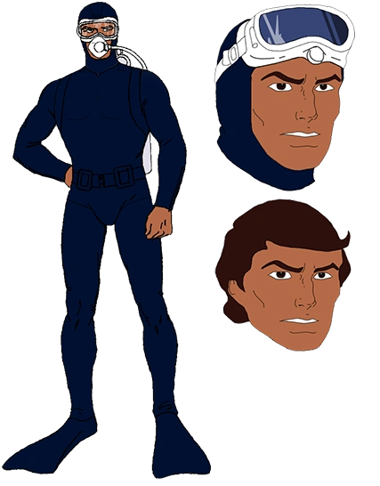 Torpedo was part of the 1983 series of A Real American Hero toys. Appearance: black diving mask with eyes exposed; black and grey diving suit with grey belt, gloves, and boots Accessories: grey scuba backpack with orange tanks; thin, black harpoon gun; two grey flippers |